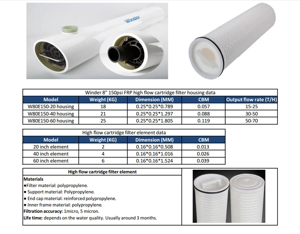 مشخصات فیلتر کارتریج جریان بالا (نوع PAKER):مدلوزن (کیلوگرم)ابعاد (متر)/۴ عددحجم (CBM)/۴ عددW80S150-20 housing 18 0.25×0.25×0.84 0.056 10-15 W80S150-40 housing 23 0.25×0.25×1.347 0.088 25-30 W80S150-60 housing 28 0.25×0.25×1.847 0.119 40-45 فیلتر ۲۰ اینچ ۱.۲ ۰.۳۶×۰.۳۸×۰.۶ ۰.۰۸۲ فیلتر ۴۰ اینچ ۲.۴ ۰.۳۶×۰.۳۸×۱.۱ ۰.۱۵۰ فیلتر ۶۰ اینچ ۳.۶ ۰.۴×۰.۳۸×۱.۶۵ ۰.۲۵۱